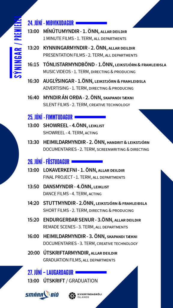 Útskrift Vor 2020 – Dagskrá23 júní 2020Fleiri fréttirVið höfum opnað fyrir umsóknir inn á Vorönn 202107 nóv. 2020Frábær árangur í Cilect stuttmynda samkeppni26 ágúst 2020Ný stjórn hjá Nemendafélagi Kvikmyndaskólans06 okt. 2020